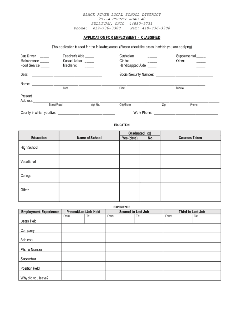 BLACK RIVER LOCAL SCHOOL DISTRICT 257A COUNTY ROAD 40 SULLIVAN, OHIO 448809731 Phone: 4197363300 Fax: 4197363308 APPLICATION FOR EMPLOYMENT CLASSIFIED This application is used for the following areas: