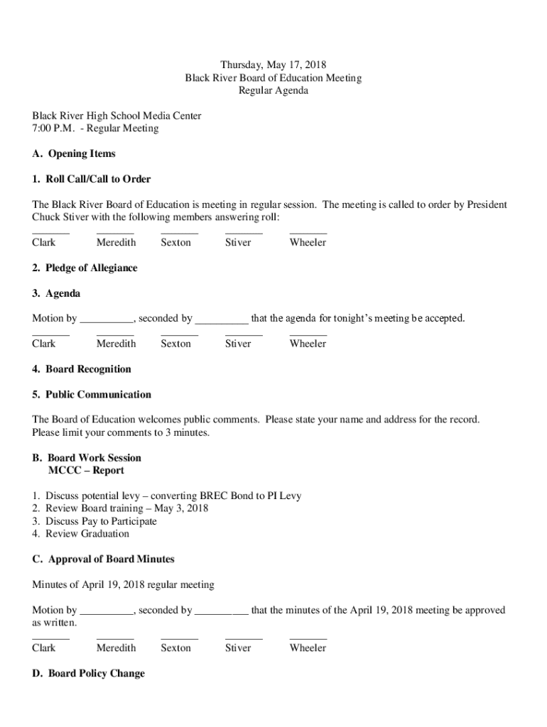Thursday, May 17, 2018, Black River Board of Education Meeting Regular Agenda Black River High School Media Center 7:00 P.M. Regular Meeting A. Opening Items 1. Roll Call/Call to Order The Black River