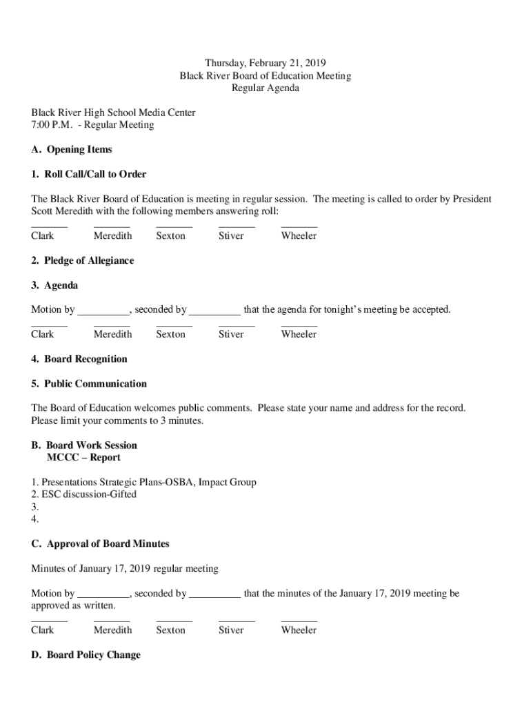 Thursday, February 21, 2019, Black River Board of Education Meeting Regular Agenda Black River High School Media Center 7:00 P.M. Regular Meeting A. Opening Items 1. Roll Call/Call to Order The Black