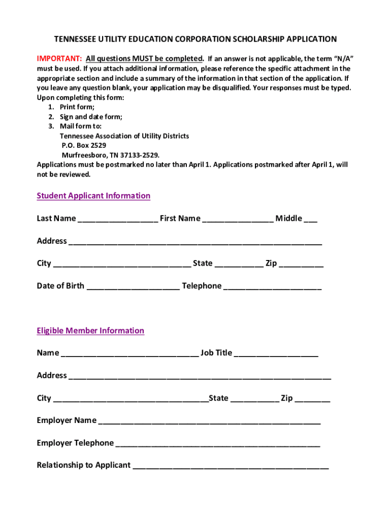 TENNESSEE UTILITY EDUCATION CORPORATION SCHOLARSHIP APPLICATIONIMPORTANT:All questions MUST be completed. If an answer is not applicable, the term N/Must be used. If you attach additional information,