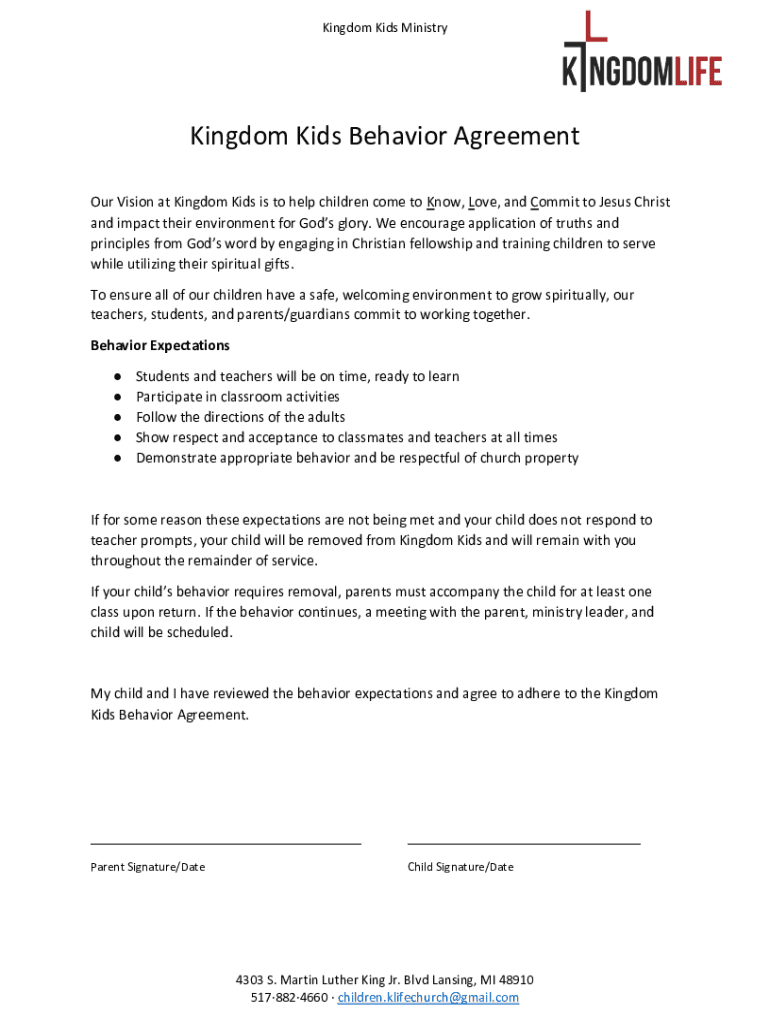 Get the free Kingdom Kids Behavior Agreement