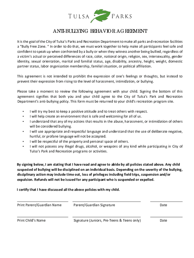 ANTIBULLYING BEHAVIOR AGREEMENT It is the goal of the City of Tulsa's Parks and Recreation Department to make all parks and recreation facilities a Bully Free Zone. In order to do that, we must work