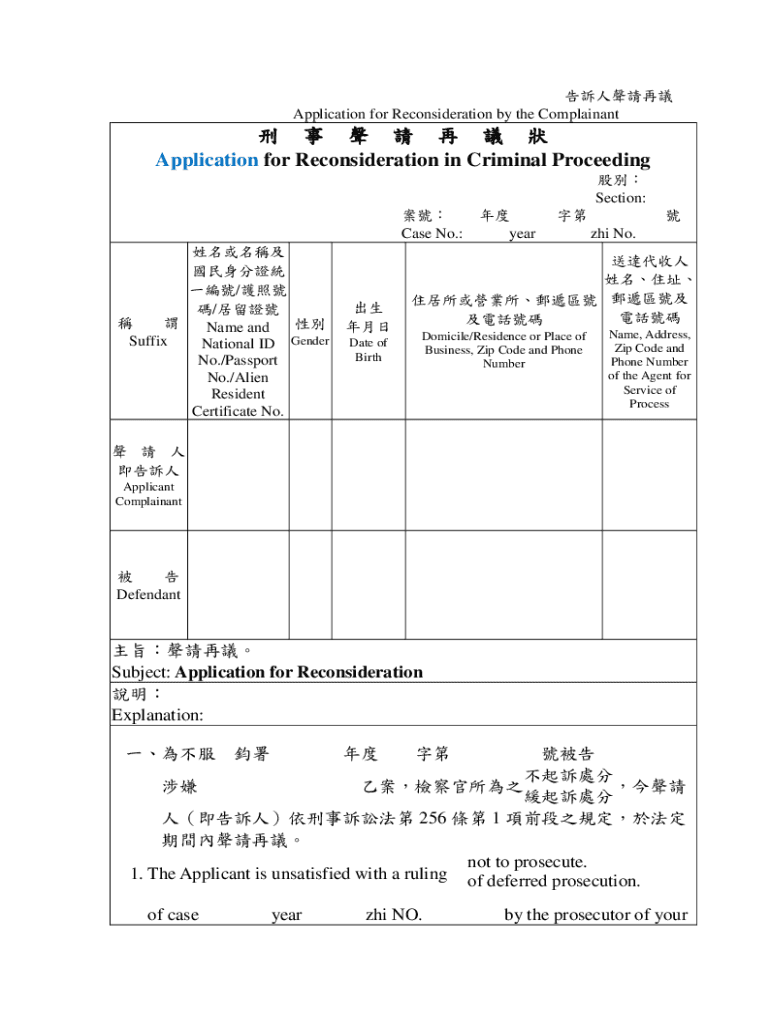 Application for Reconsideration by the Complainant Application for Reconsideration in Criminal Proceeding Section: Case No.: / / Name and Gender Suffix National ID No./Passport No./Alien Resident