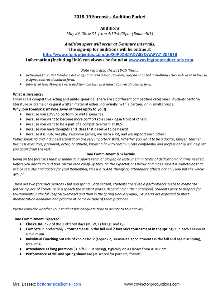 201819 Forensics Audition Packet Auditions May 29, 30, & 31 from 4:105:30pm (Room 401) Audition spots will occur at 5minute intervals. The sign-up for auditions will be online at http://www.signupgenius.com/go/20F0D45ADA82DAAFA7201819