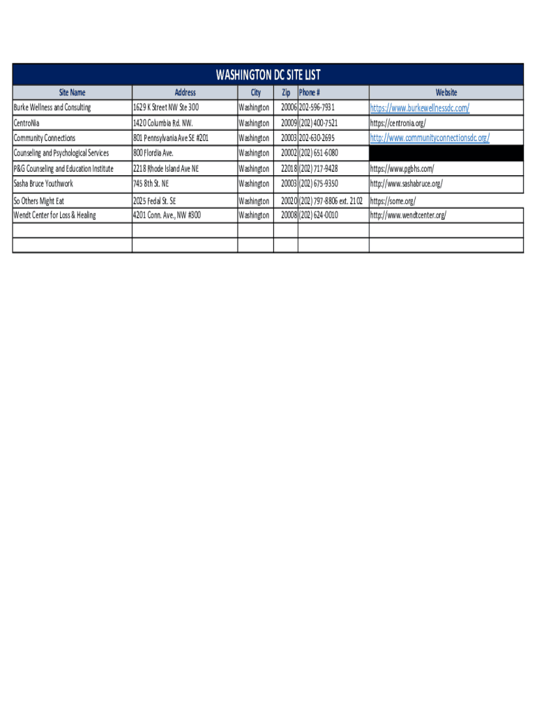 WASHINGTON DC SITE LIST Site Name Burke Wellness and Consulting Centroid Community Connections Counseling and Psychological Services P&G Counseling and Education Institute Sasha Bruce YouthworkAddress