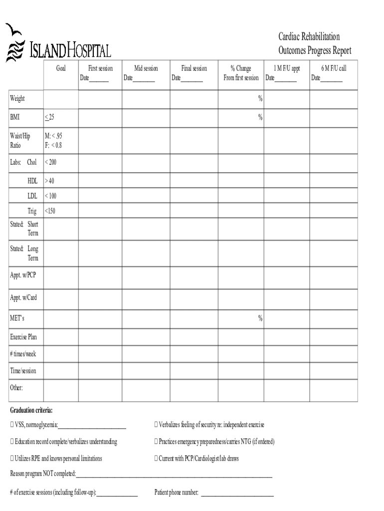 Cardiac Rehabilitation Outcomes Progress Report Golfers session Date___Mid-session Date___Final session Date___% Change From first sessionWeight1 M F/U apt Date___BMI 25Waist/Hip Ratio: .95 F: 0.8Labs:Cool