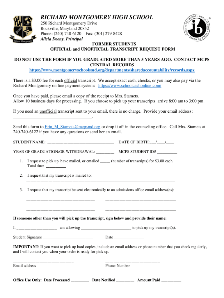 RICHARD MONTGOMERY HIGH SCHOOL 250 Richard Montgomery Drive Rockville, Maryland 20852 Phone: (240) 7406120 Fax: (301) 2798428 Alicia Deny, Principal FORMER STUDENTS OFFICIAL and UNOFFICIAL TRANSCRIPT