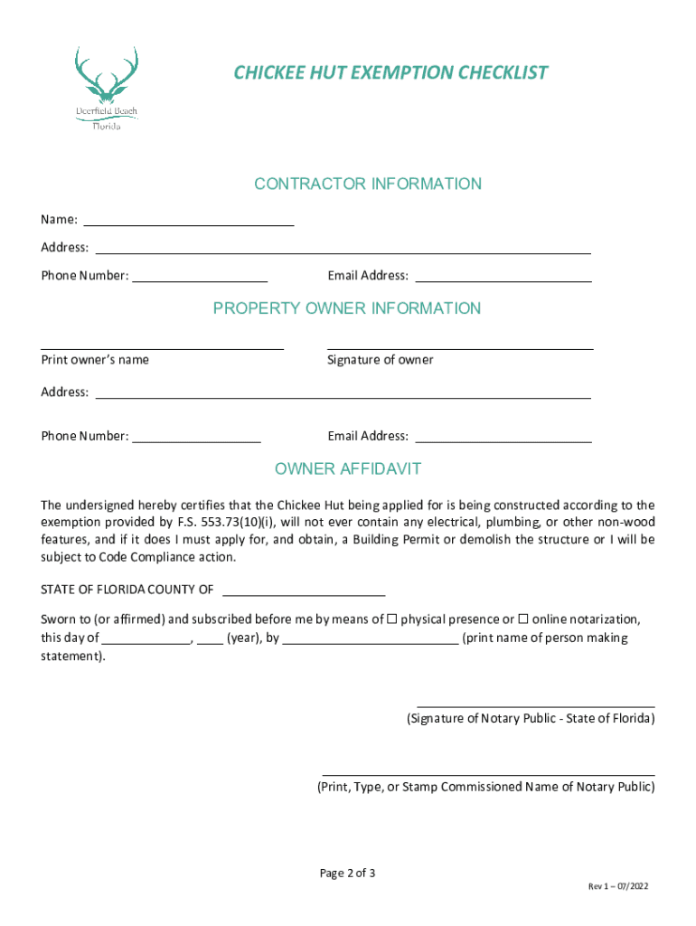 CHICKEN HUT EXEMPTION CHECKLIST Deerfield Beach FloridaComplete Application: Incomplete applications cannot be accepted. Proof of Ownership: Warranty Deed or property appraisers information from www.bcpa.netOwners