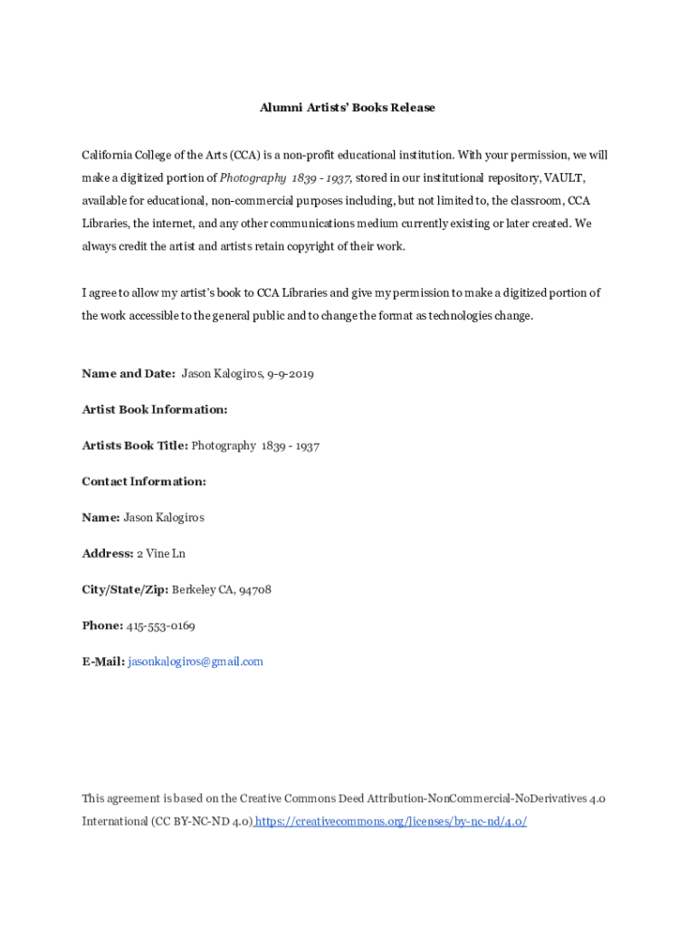 Alumni Artists Books Release California College of the Arts (CCA) is a nonprofit educational institution. With your permission, we will make a digitized portion of Photography 1839 1937, stored in