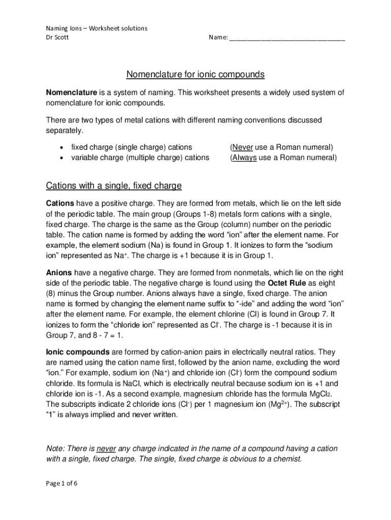 Naming Ions Worksheet solutions Dr Cottage: ___Nomenclature for ionic compounds Nomenclature is a system of naming. This worksheet presents a widely used system of nomenclature for ionic compounds.
