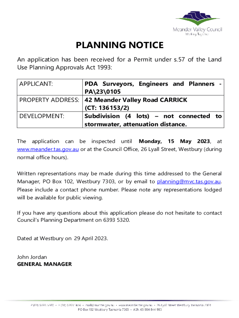 PLANNING NOTICE An application has been received for a Permit under s.57 of the Land Use Planning Approvals Act 1993: APPLICANT:PDA Surveyors, Engineers and Planners PA230105 PROPERTY ADDRESS: 42