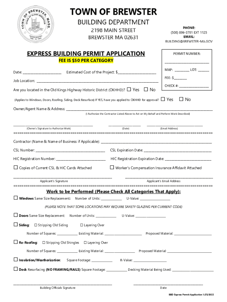 EXPRESS BUILDING PERMIT APPLICATIONPERMIT NUMBER:FEE IS $50 PER CATEGORY___Date: ___Estimated Cost of the Project: $___Job Location: ___ Are you located in the Old Kings Highway Historic District