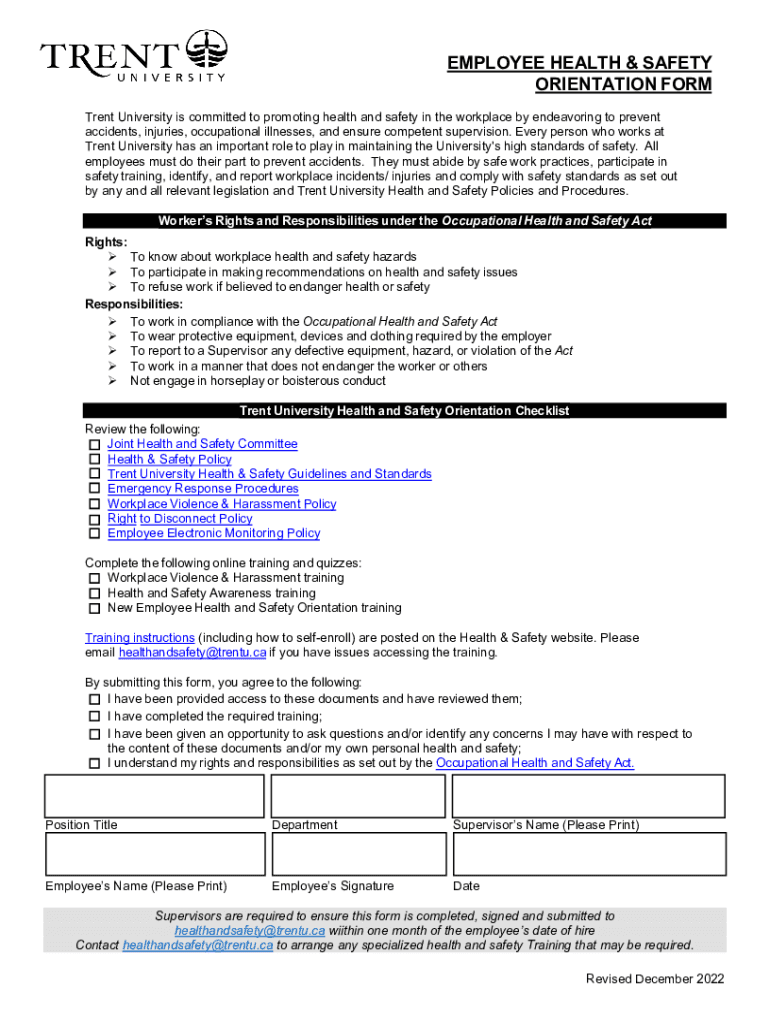 EMPLOYEE HEALTH & SAFETY ORIENTATION FORM Trent University is committed to promoting health and safety in the workplace by endeavoring to prevent accidents, injuries, occupational illnesses, and ensure
