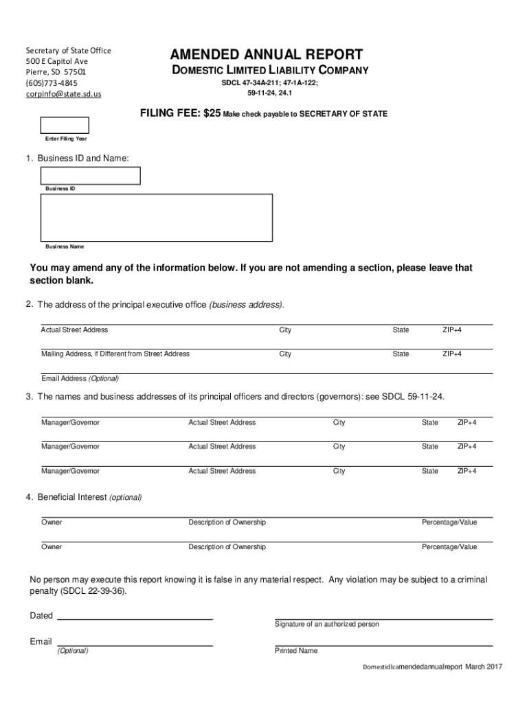 Secretary of State Office 500 E Capitol Ave Pierre, SD 57501 (605)7734845 corpinfo@state.sd.usAMENDED ANNUAL REPORT DOMESTIC LIMITED LIABILITY COMPANY DCL 4734A211; 471A122; 591124, 24.1FILING FEE: