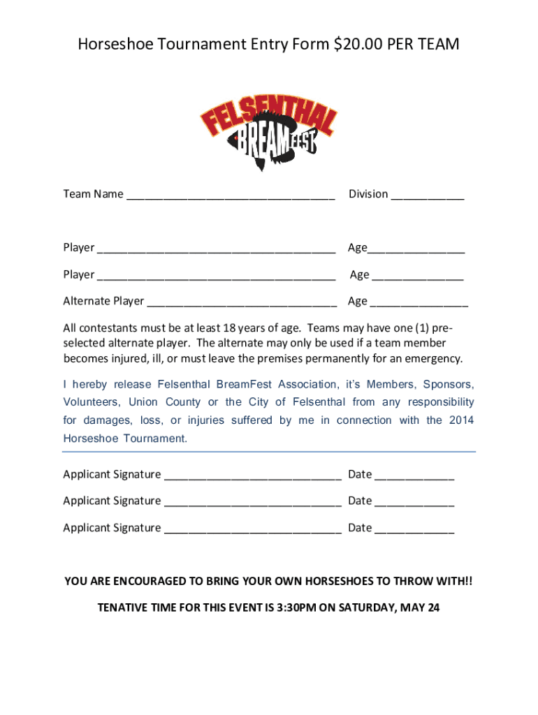 Get the free Horseshoe Tournament Entry Form $20.00 PER TEAM