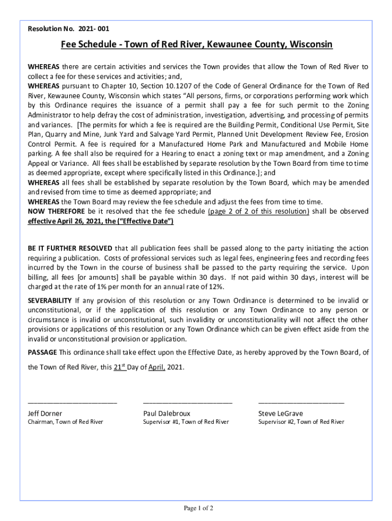 Resolution No. 2021 001Fee Schedule Town of Red River, Detainee County, Wisconsin WHEREAS there are certain activities and services the Town provides that allow the Town of Red River to collect a
