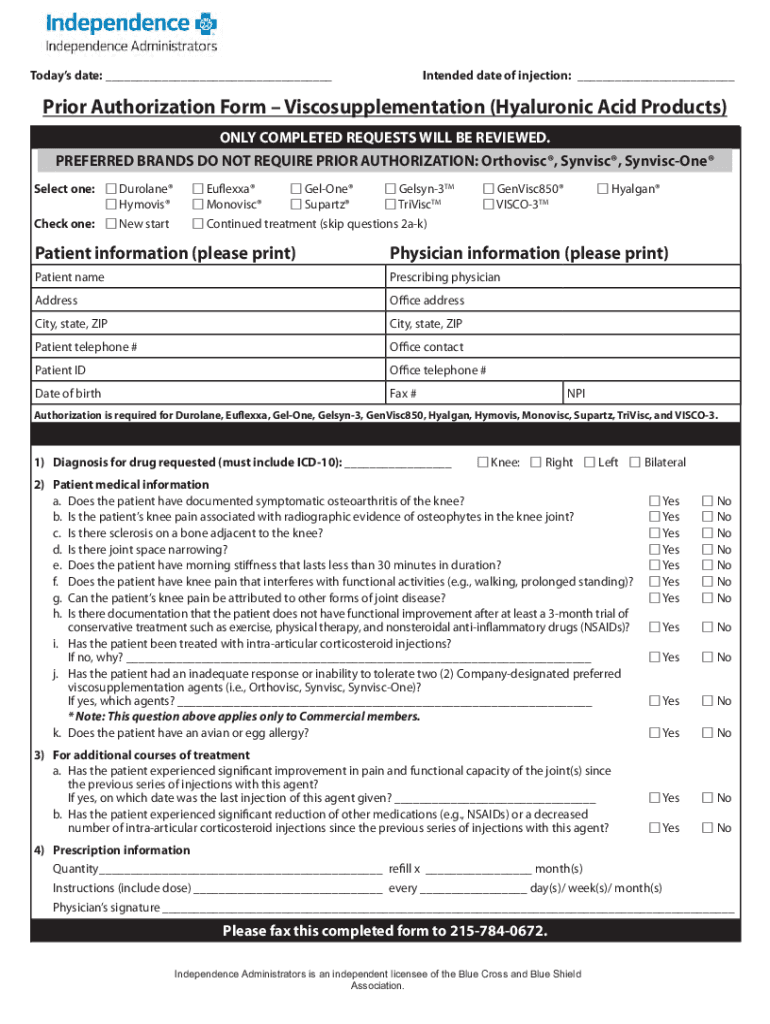 Today's date: ___Intended date of injection: ___Prior Authorization Form Viscosupplementation (Hyaluronic Acid Products)