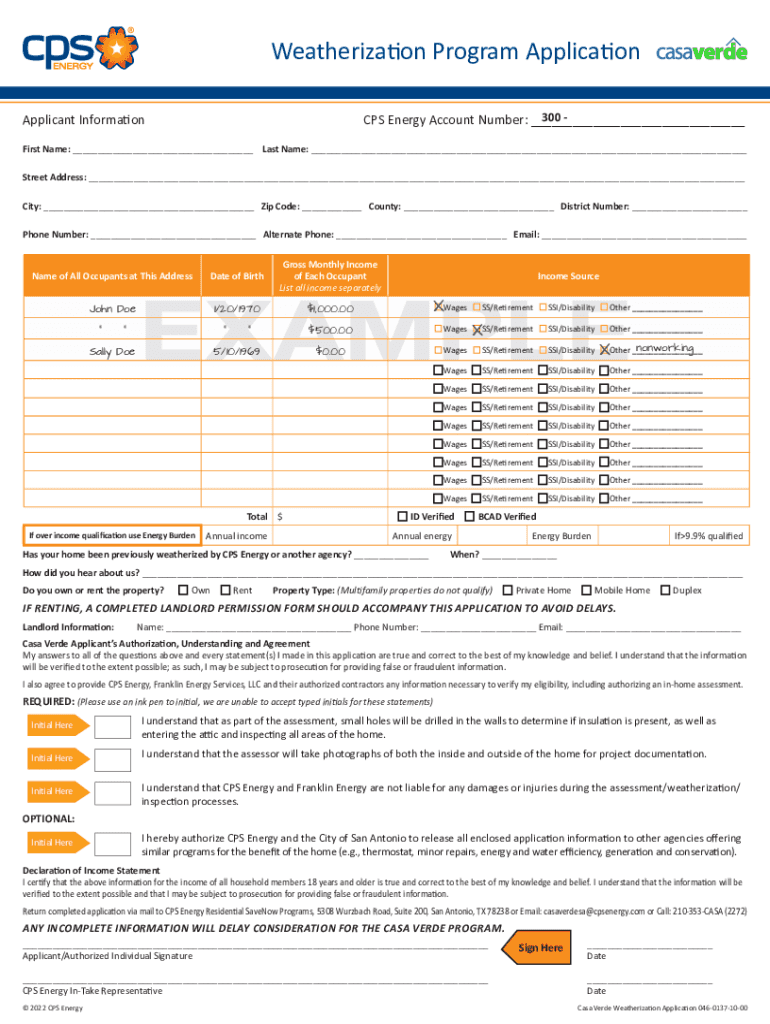 Weatherization Program Application 300 CPS Energy Account Number: ___Applicant InformationFirst Name: ___ Last Name: ___ Street Address: ___ City: ___ Zip Code: ___ County: ___ District Number: ___