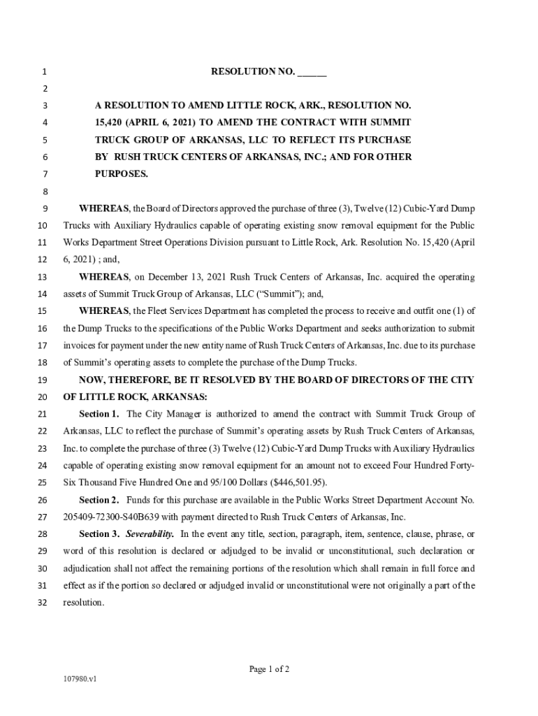 RESOLUTION NO. ___1 2 3A RESOLUTION TO AMEND LITTLE ROCK, ARK., RESOLUTION NO.415,420 (APRIL 6, 2021) TO AMEND THE CONTRACT WITH SUMMIT5TRUCK GROUP OF ARKANSAS, LLC TO REFLECT ITS PURCHASE6BY RUSH