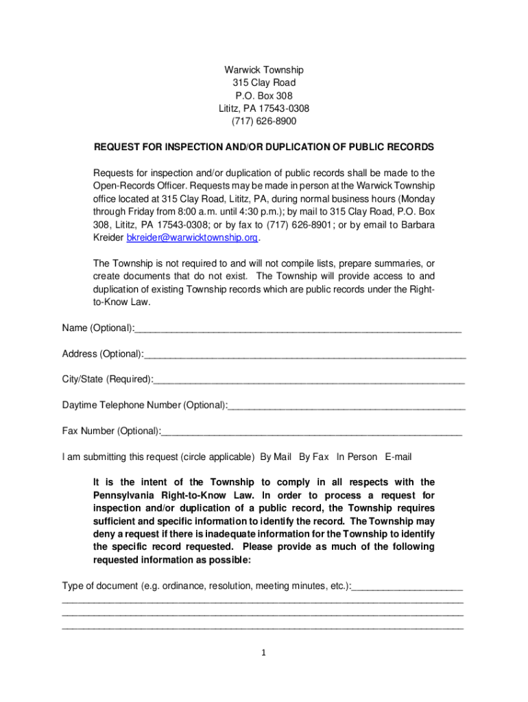 Warwick Township 315 Clay Road P.O. Box 308 Limit, PA 175430308 (717) 6268900 REQUEST FOR INSPECTION AND/OR DUPLICATION OF PUBLIC RECORDS Requests for inspection and/or duplication of public records