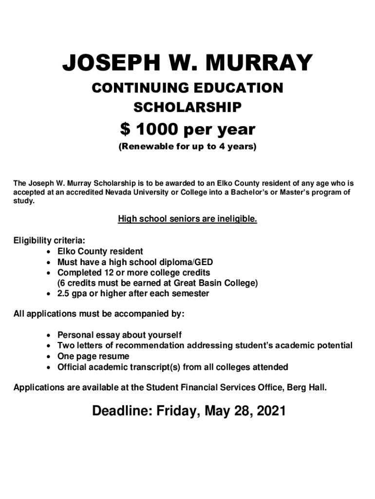 JOSEPH W. MURRAY CONTINUING EDUCATION SCHOLARSHIP 1000 per year (Renewable for up to 4 years)The Joseph W. Murray Scholarship is to be awarded to an Elk County resident of any age who is accepted