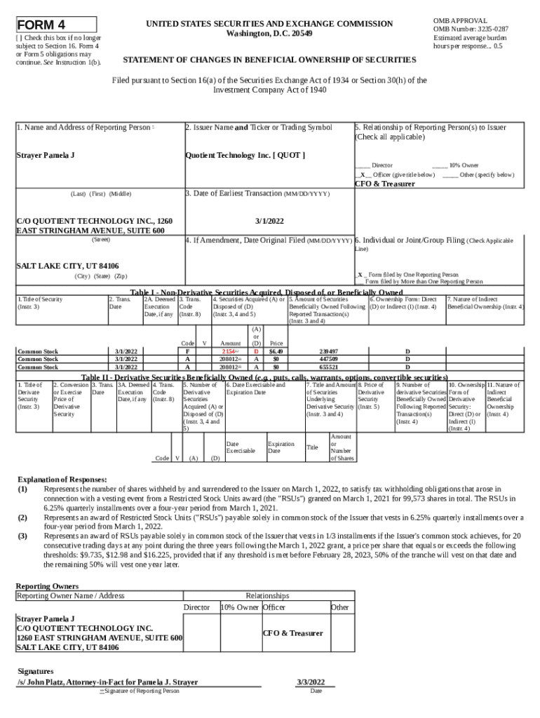 The Represents the number of shares withheld by and surrendered to the Issuer on March 1, 2022, to satisfy tax withholding obligations that arose in connection with a vesting event from a Restricted Stock Units award (the "RSUs") granted on Mar is a document needed to be submitted to the relevant address to provide some information. It must be completed and signed, which is possible manually in hard copy, or using a certain solution such as PDFfiller. It allows to complete any PDF or Word document right in the web, customize it depending on your needs and put a legally-binding e-signature. Right away after completion, the user can easily send the Represents the number of shares withheld by and surrendered to the Issuer on March 1, 2022, to satisfy tax withholding obligations that arose in connection with a vesting event from a Restricted Stock Units award (the "RSUs") granted on Mar to the appropriate person, or multiple individuals via email or fax. The template is printable as well because of PDFfiller feature and options proposed for printing out adjustment. Both in electronic and in hard copy, your form will have got organized and professional look. Also you can turn it into a template to use later, there's no need to create a new blank form over and over. You need just to edit the ready template.