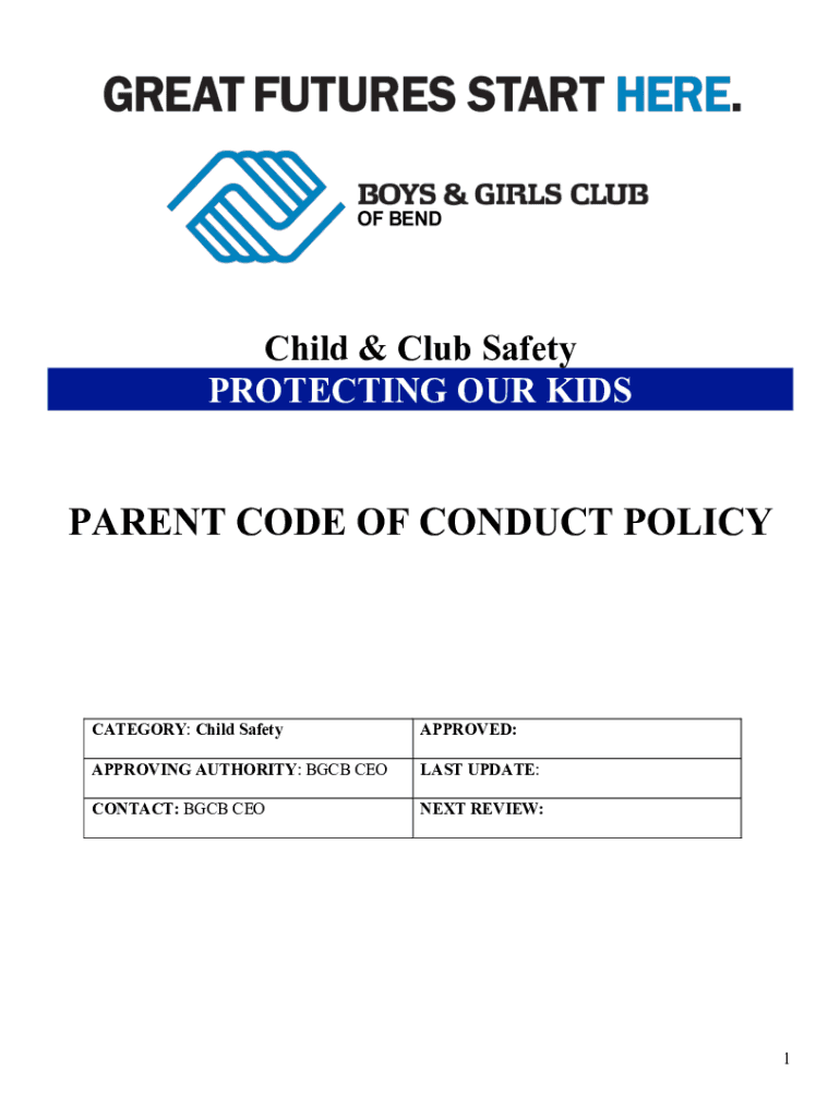 PROTECTING OUR GODPARENT CODE OF CONDUCT POLICYCATEGORY: Child SafetyAPPROVED:APPROVING AUTHORITY: GCB COAST UPDATE:CONTACT: GCB CONTEXT REVIEW:1Child & Club Safety