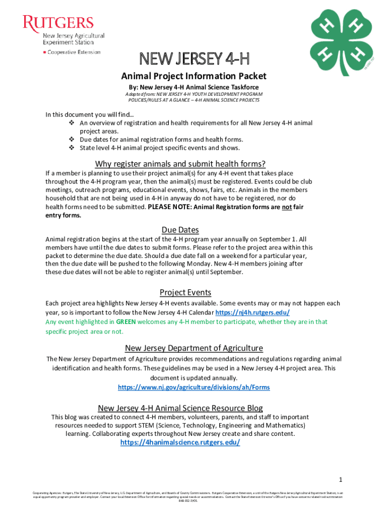 NEW JERSEY 4H Animal Project Information Packet By: New Jersey 4H Animal Science Taskforce Adapted from: NEW JERSEY 4H YOUTH DEVELOPMENT PROGRAM POLICIES/RULES AT A GLANCE 4H ANIMAL SCIENCE PROJECTS