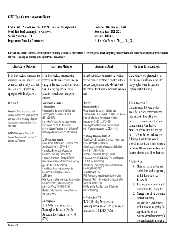 GBC Class/Course Assessment Report Course Prefix, Number, and Title: EDSP453 Behavior Management & Socioemotional Learning in the Classroom Section Number(s): 1001 Department: Education DepartmentInstructor: