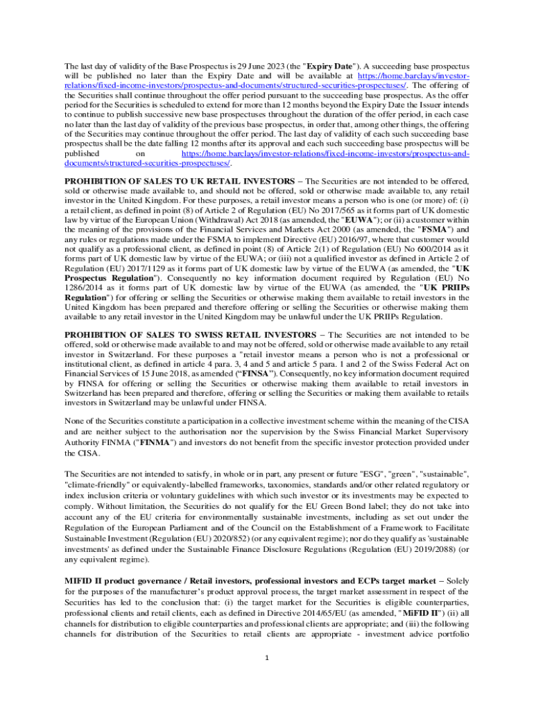 The last day of validity of the Base Prospectus is 29 June 2023 (the \” Expiry Date\”). A succeeding base prospectus will be published no later than the Expiry Date and will be available at https://home.barclays/investorrelations/fixedincomeinvestors/prospectusanddocuments/structuredsecuritiesprospectuses/.
