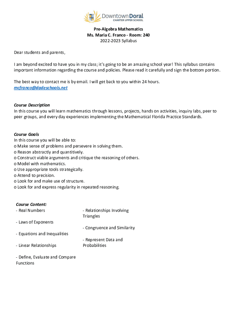 Pre-algebra Mathematics Ms. Maria C. Franco Room: 240 20222023 Syllabus Dear students and parents, I am beyond excited to have you in my class; it's going to be an amazing school year! This syllabus