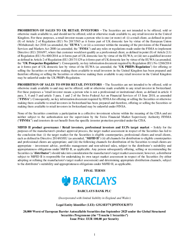 PROHIBITION OF SALES TO UK RETAIL INVESTORS The Securities are not intended to be offered, sold or otherwise made available to, and should not be offered, sold or otherwise made available to, any