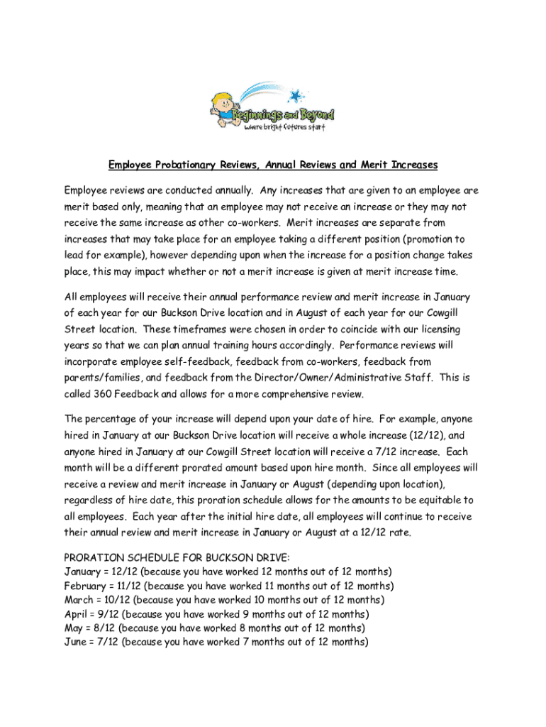Employee Probationary Reviews, Annual Reviews and Merit Increases Employee reviews are conducted annually. Any increases that are given to an employee are merit based only, meaning that an employee