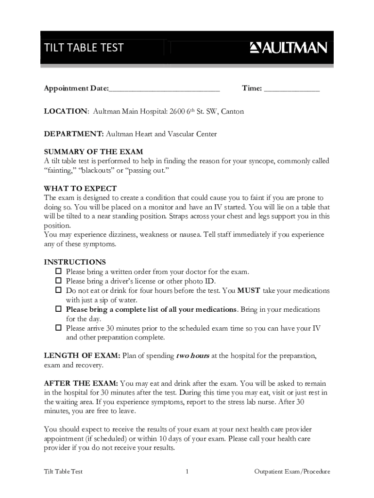 TILT TABLE TEST Appointment Date:___Time: ___LOCATION: Altman Main Hospital: 2600 6th St. SW, Canton DEPARTMENT: Altman Heart and Vascular Center SUMMARY OF THE EXAM A tilt table test is performed