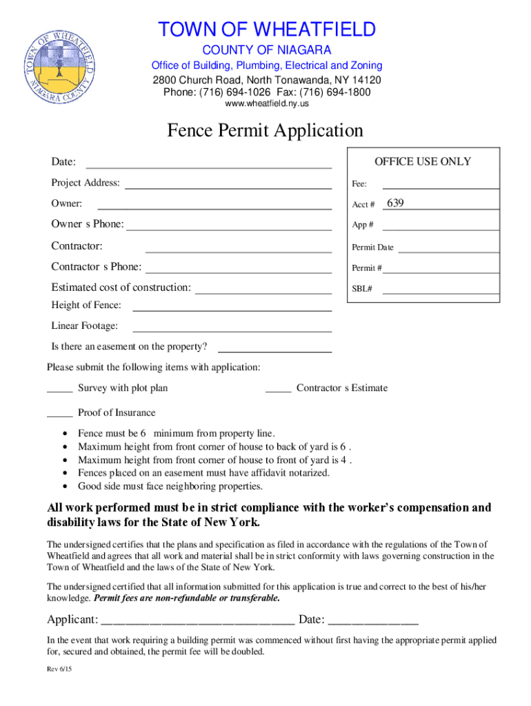 TOWN OF HATFIELD COUNTY OF NIAGARA Office of Building, Plumbing, Electrical and Zoning 2800 Church Road, North Lawanda, NY 14120 Phone: (716) 6941026 Fax: (716) 6941800 www.wheatfield.ny.usFence Permit