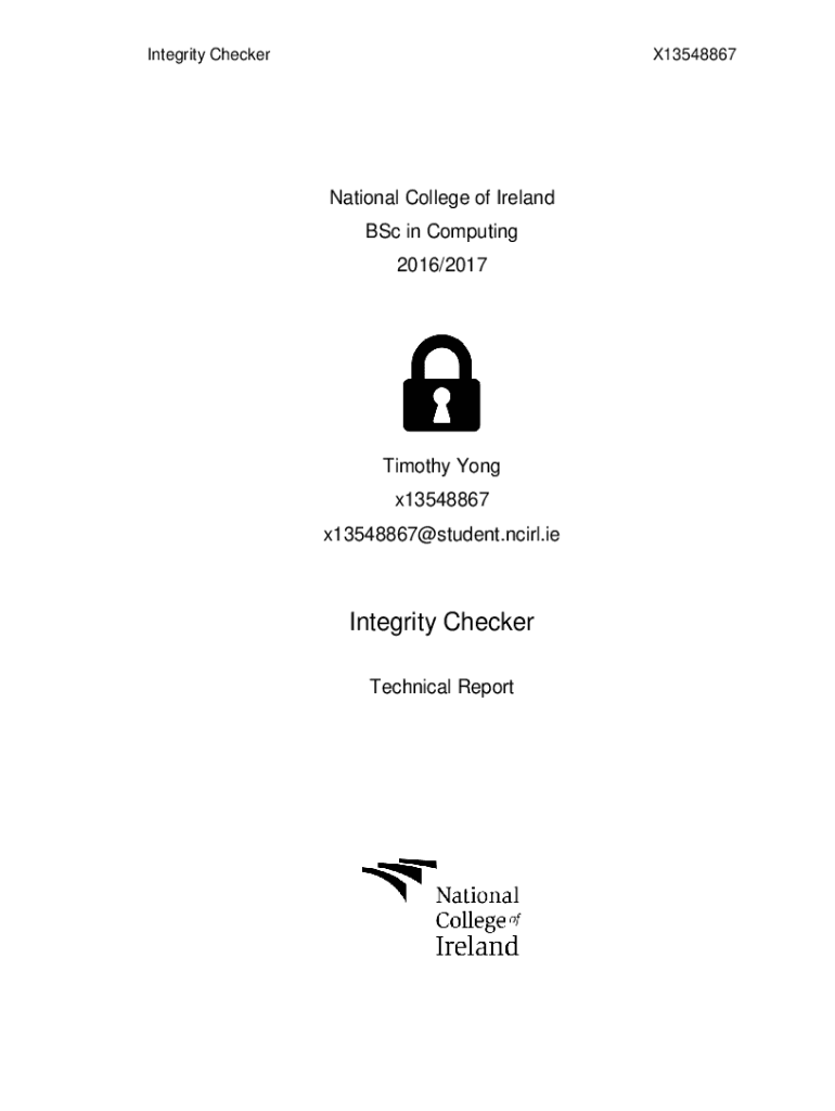 Integrity CheckerX13548867National College of Ireland B.Sc. in Computing 2016/2017Timothy Yong x13548867 x13548867@student.ncirl.ieIntegrity Checker Technical ReportDeclaration Cover Sheet for Project