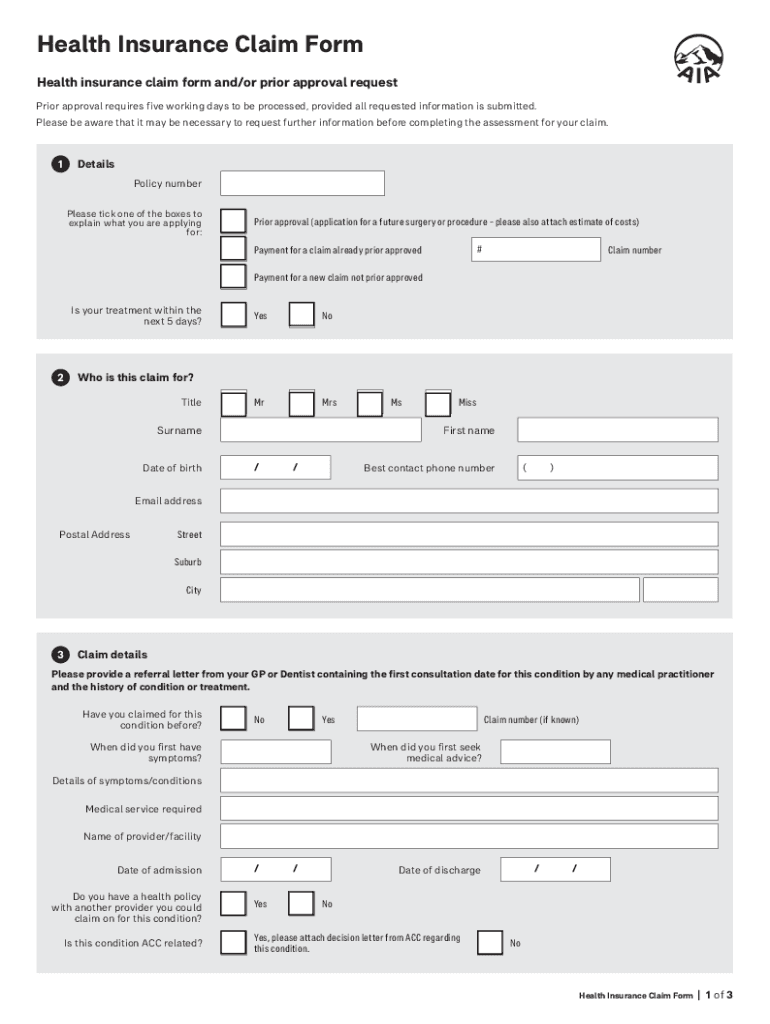 Health Insurance Claim Form Health insurance claim form and/or prior approval request Prior approval requires five working days to be processed, provided all requested information is submitted. Please