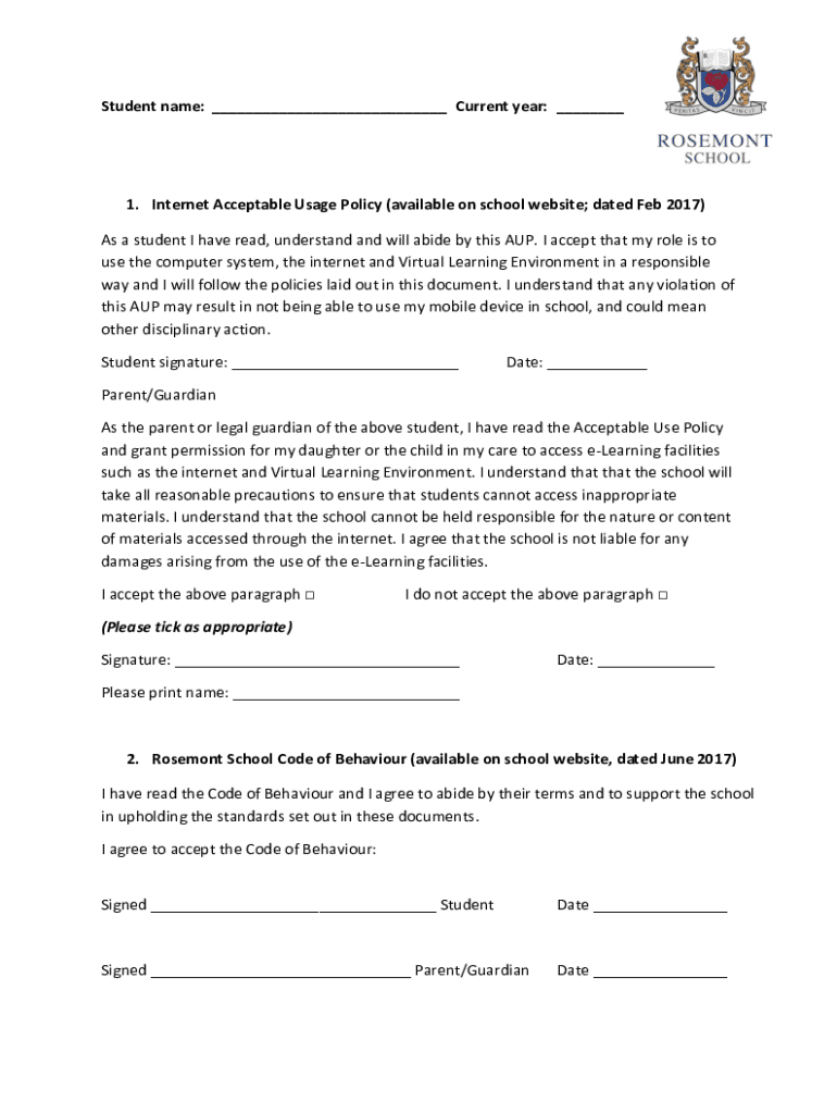 Student name: ___ Current year: ___1. Internet Acceptable Usage Policy (available on school website; dated Feb 2017) As a student I have read, understand and will abide by this AUP. I accept that