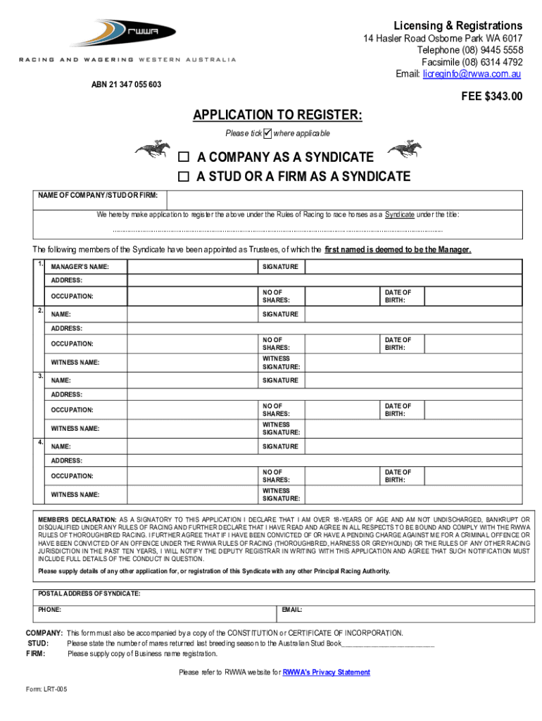 Licensing & Registrations 14 Hauler Road Osborne Park WA 6017 Telephone (08) 9445 5558 Facsimiles (08) 6314 4792 Email: licreginfo@rwwa.com.auABN 21 347 055 603FEE $343.00APPLICATION TO REGISTER: