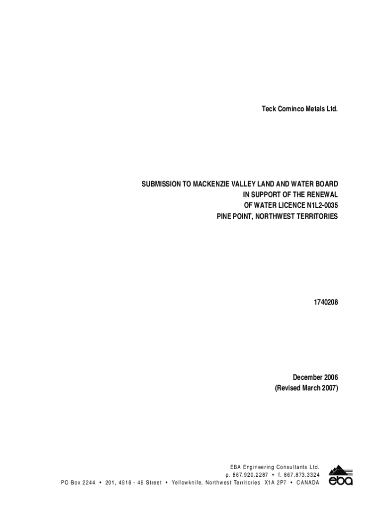 Deck Coming Metals Ltd. SUBMISSION TO MACKENZIE VALLEY LAND AND WATER BOARD IN SUPPORT OF THE RENEWAL OF WATER License N1L20035 PINE POINT, NORTHWEST TERRITORIES1740208December 2006 (Revised March