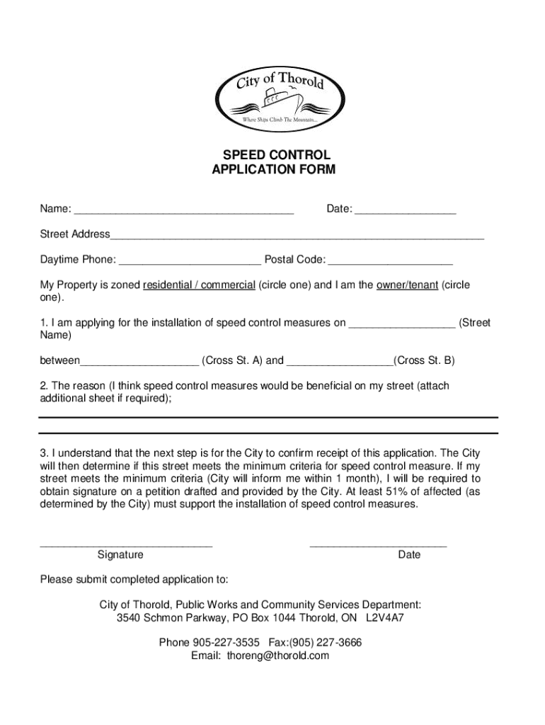 SPEED CONTROL APPLICATION FORM Name: ___Date: ___Street Address___ Daytime Phone: ___ Postal Code: ___ My Property is zoned residential / commercial (circle one) and I am the owner/tenant (circle