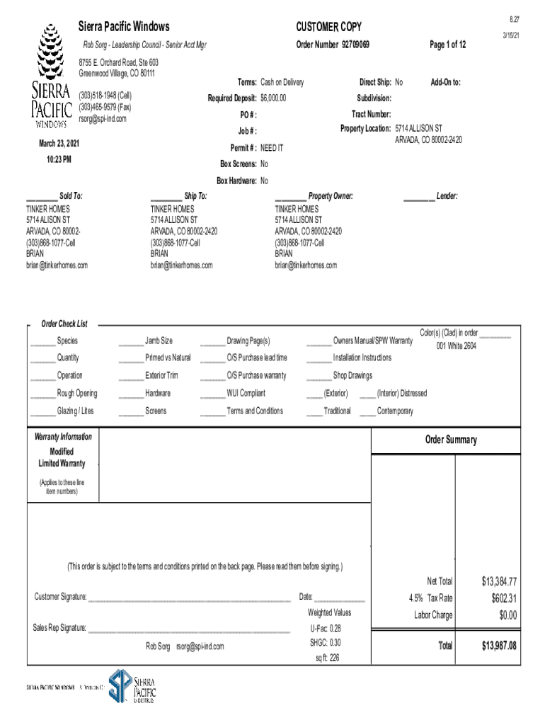 Sierra Pacific Windows8.27CUSTOMER COPY Order Number 92709069Rob Song Leadership Council Senior Acct Mgr 8755 E. Orchard Road, Ste 603 Greenwood Village, CO 80111Terms: Cash on Delivery(303)5181948