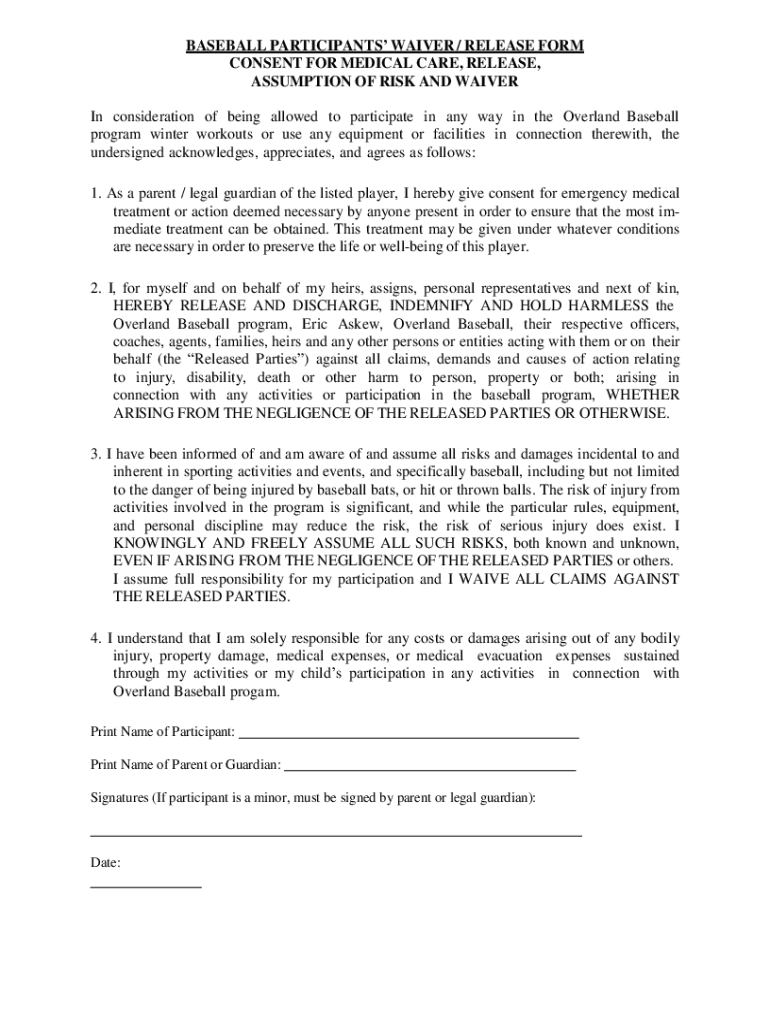 BASEBALL PARTICIPANTS WAIVER / RELEASE FORM CONSENT FOR MEDICAL CARE, RELEASE, ASSUMPTION OF RISK AND WAIVER In consideration of being allowed to participate in any way in the Overland Baseball program