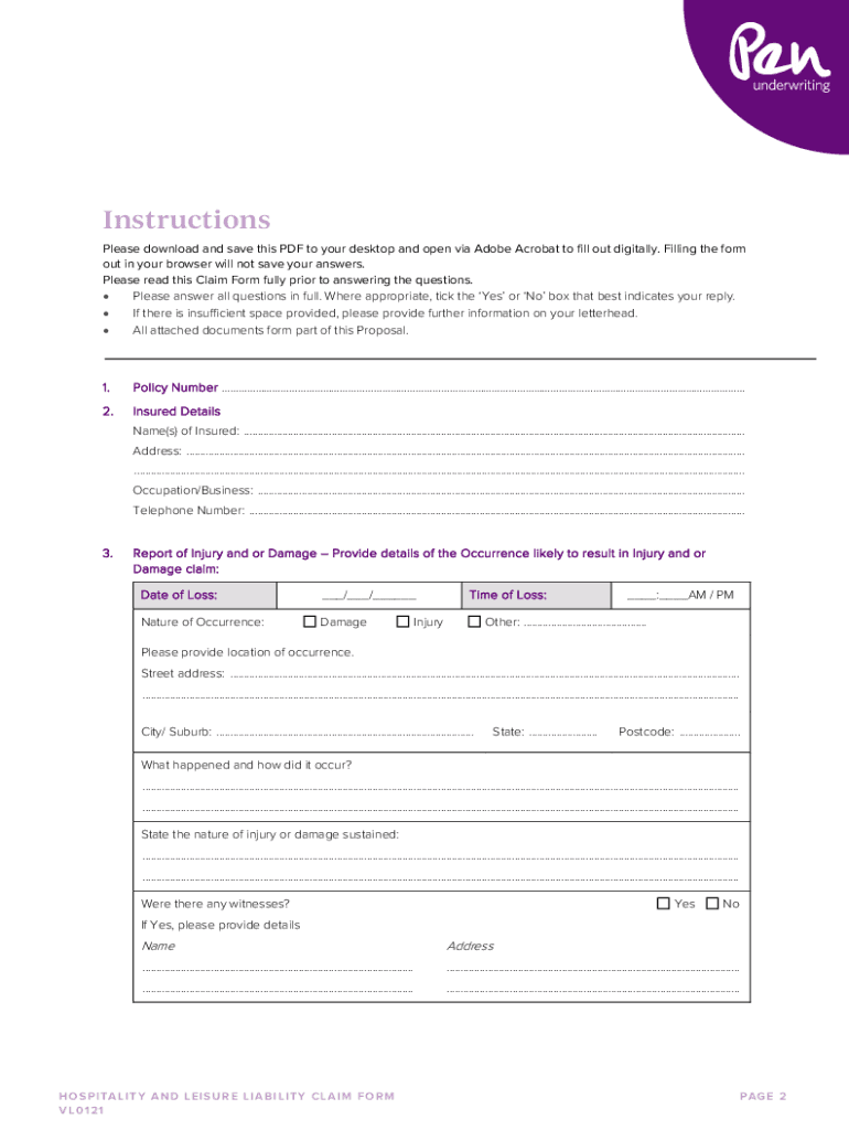 Hospitality & Leisure Liability Claim Form L0121Important Notices PEN UNDERWRITING PTY LTD ABN 89 113 929 516 ADSL 290518 Please send your completed Claim Form to Pen Underwriting Hospitality & Leisure