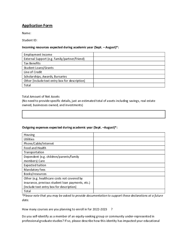 Application Form Name: Student ID: Incoming resources expected during academic year (Sept. August)*: Employment Income External Support (e.g. family/partner/friend) Tax Benefits Student Loans/Grants