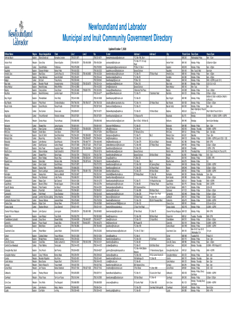 Newfoundland and Labrador Municipal and Inuit Community Government Directory Updated October 7, 2020, Official NameRegionMayor/AngajukKakClerkLine 1Admirals BeachEasternElaine DoodyactBernadine Lineman(709)