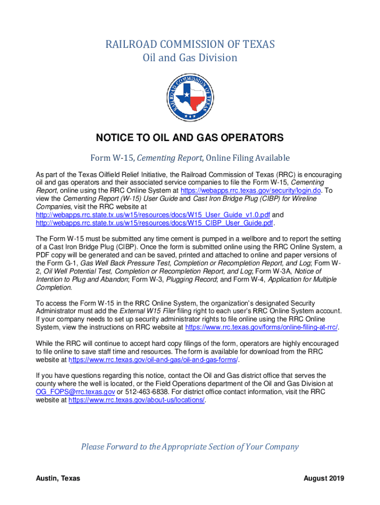 RAILROAD COMMISSION OF TEXAS Oil and Gas DivisionNOTICE TO OIL AND GAS OPERATORS Form W15, Cementing Report, Online Filing Available As part of the Texas Oilfield Relief Initiative, the Railroad Commission