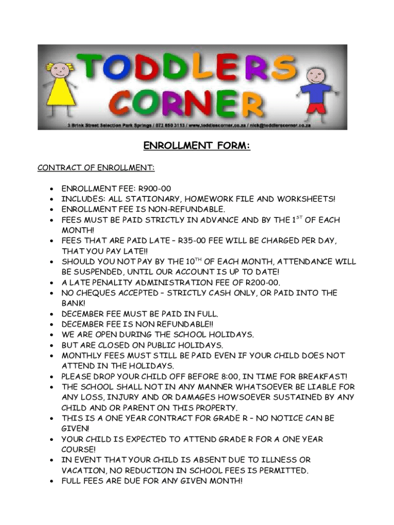 ENROLLMENT FORM: CONTRACT OF ENROLLMENT: ENROLLMENT FEE: R90000 INCLUDES: ALL STATIONARY, HOMEWORK FILE AND WORKSHEETS! ENROLLMENT FEE IS NONREFUNDABLE. FEES MUST BE PAID STRICTLY IN ADVANCE AND BY