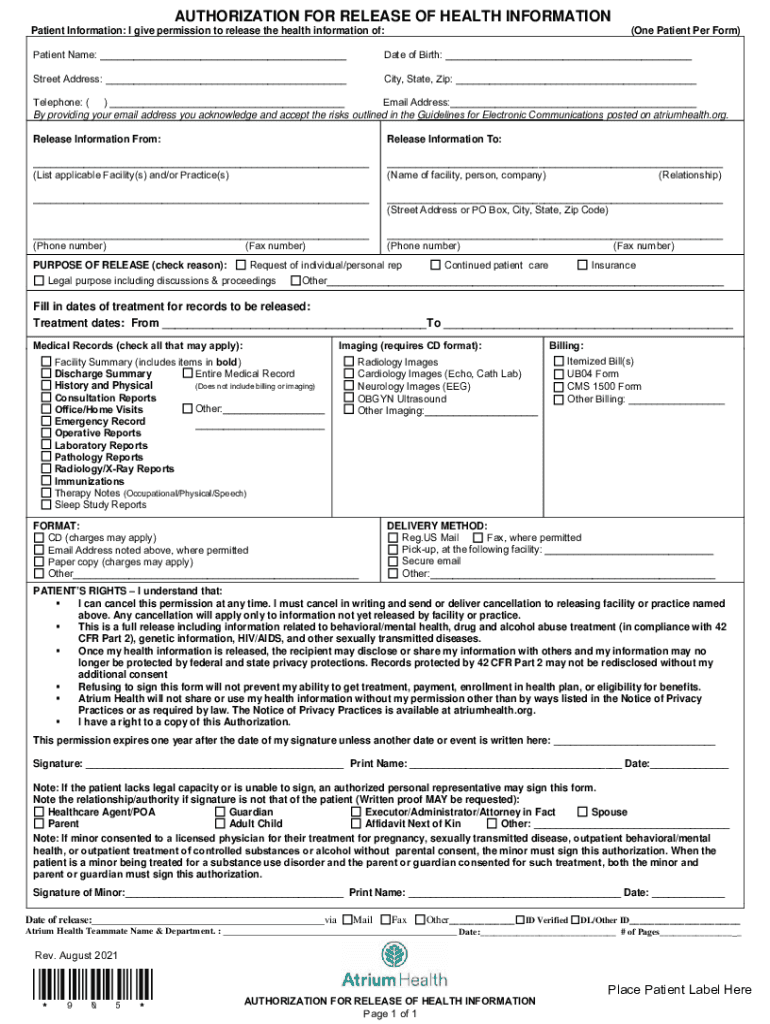 AUTHORIZATION FOR RELEASE OF HEALTH INFORMATION Patient Information: I give permission to release the health information of:(One Patient Per Form)Patient Name: ___Date of Birth: ___Street Address: