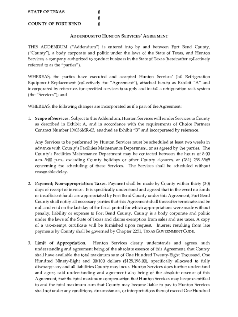 STATE OF TEXAS COUNTY OF FORT BEND ADDENDUM TO HUSTON SERVICES AGREEMENT THIS ADDENDUM (Addendum) is entered into by and between Fort Bend County, (County), a body corporate and politic under the